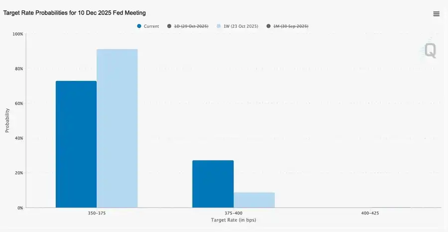 由于政府停摆引发的数据空白期,美联储几乎是在「盲开」。鲍威尔对交易员的暗示非常清楚:12 月能否公布利率尚无定论。降息预期迅速回落,短端利率曲线趋平,市场正在消化从「数据驱动」转向「数据缺失」的谨慎。