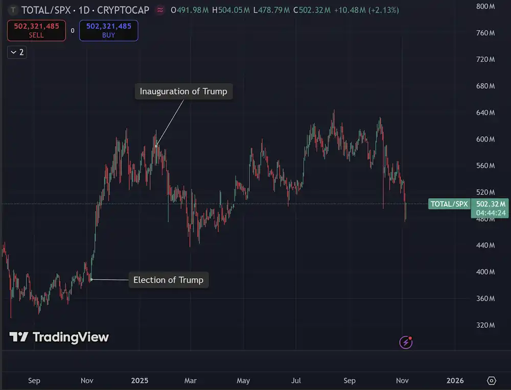 除了特朗普去年 11 月当选后短暂的上涨外,加密市场总市值(TOTAL)与标普 500 指数的比值已近一年保持平稳。事实上,自 1 月 20 日特朗普正式就职以来,这一比值甚至出现了惊人的负增长。