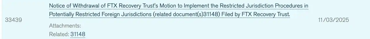 美国特拉华州破产法院于 2025 年 10 月 23 日对 FTX 追偿信托(FTX Recovery Trust)拟将中国大陆等 49 个司法辖区的债权人排除在主要赔付名单之外的动议再次听证后,迫于各方压力,FTX 追偿信托已正式撤回动议。