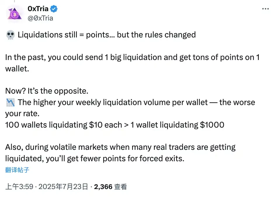 而有意思的是,早期 Lighter 的积分权重中对清算金额的权重是比较大的,据 Lighter 社区成员 0 xTria 的分析,当时账户的首次爆仓是「每爆仓 1 美元≈1 积分」,而社区对积分的估值是在 15-30 美元,这直接诱发了不少用户利用子账户和新账户来「刷爆仓换积分」的套利。不过在数周后的版本里,这一权重已被显著削弱了。