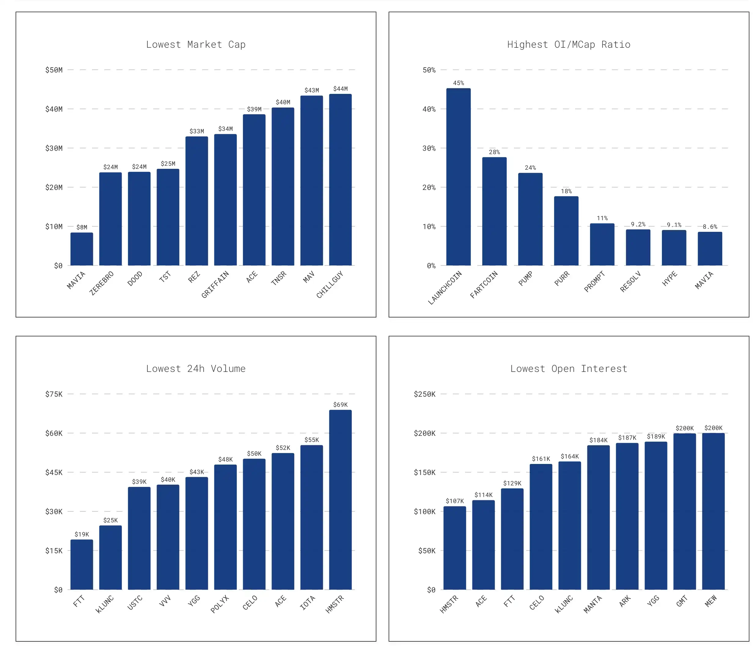 比如 OI/市值比率数据。未平仓合约(OI)除以市值,用百分比表示。比率越高,说明衍生品仓位在代币体量里占比越大,更容易被资金推动。典型的例子是此前 HLP 清算金库继承的头寸一度超过 JELLY 流通量的 40%,于是币价就像多米诺骨牌一样,一推就倒。