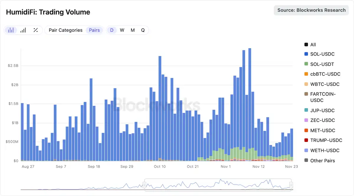 目前,HumidiFi 已成为了 Solana 链上实际交易量最大的去中心化交易平台(DEX),日均处理交易额超 10 亿美元——约占 Solana 全部现货 DEX 交易活动的 35%,Solana 每日收入的约 4% 都来自这些交易。