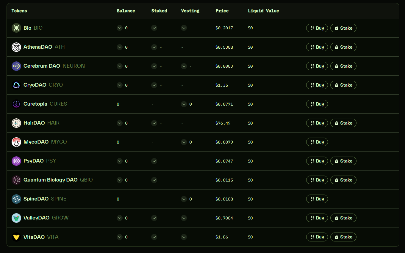- 流动性协议:BIO Protocol 提供链上流动性池,支持 BioDAO 代币与 ETH 的流动性交易,促进 DeSci 生态系统的健康发展。