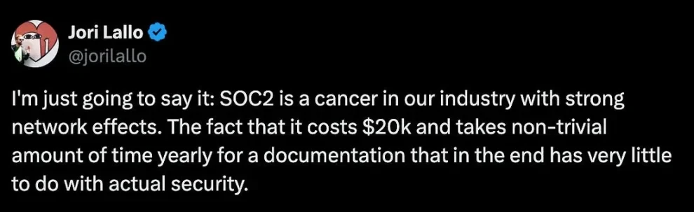 如果资金停滞在后台文书工作中,快速、流动的市场就毫无用处。Vanta 是一家监管科技(reg-tech)初创公司的例子,它将 SOC 2 合规从顾问和截图转移到了 API。向财富 500 强公司销售软件的初创公司需要 SOC 2 证书。这应该证明你遵守了合理的安全实践,避免将客户数据存储在无保护的公开链接中。