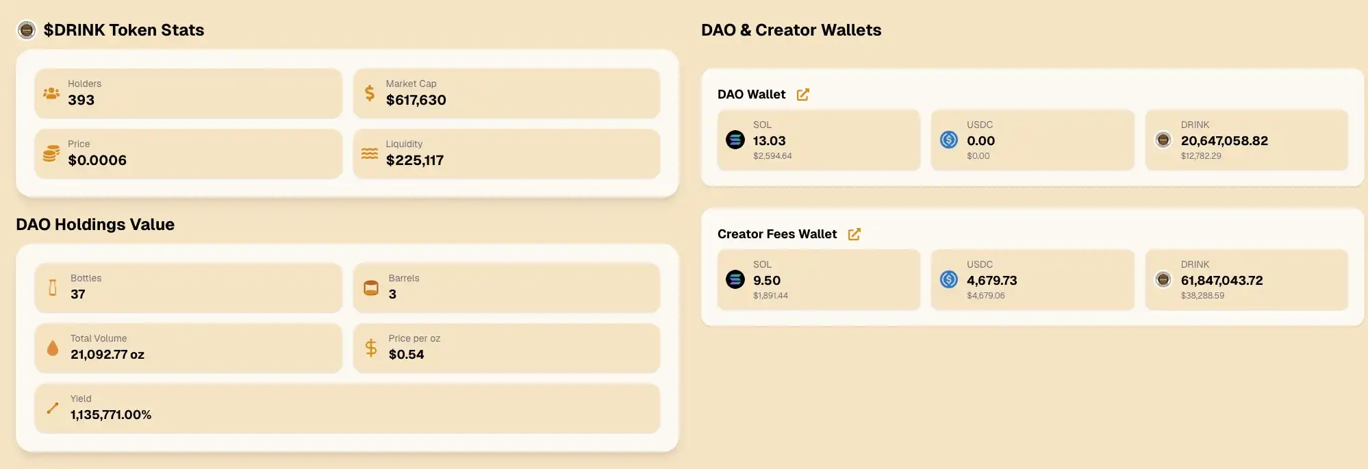 而 Drink 则是 Baxus 创始人推动的 DAO 组织的代币,他推出了一个酒精「微策略」概念