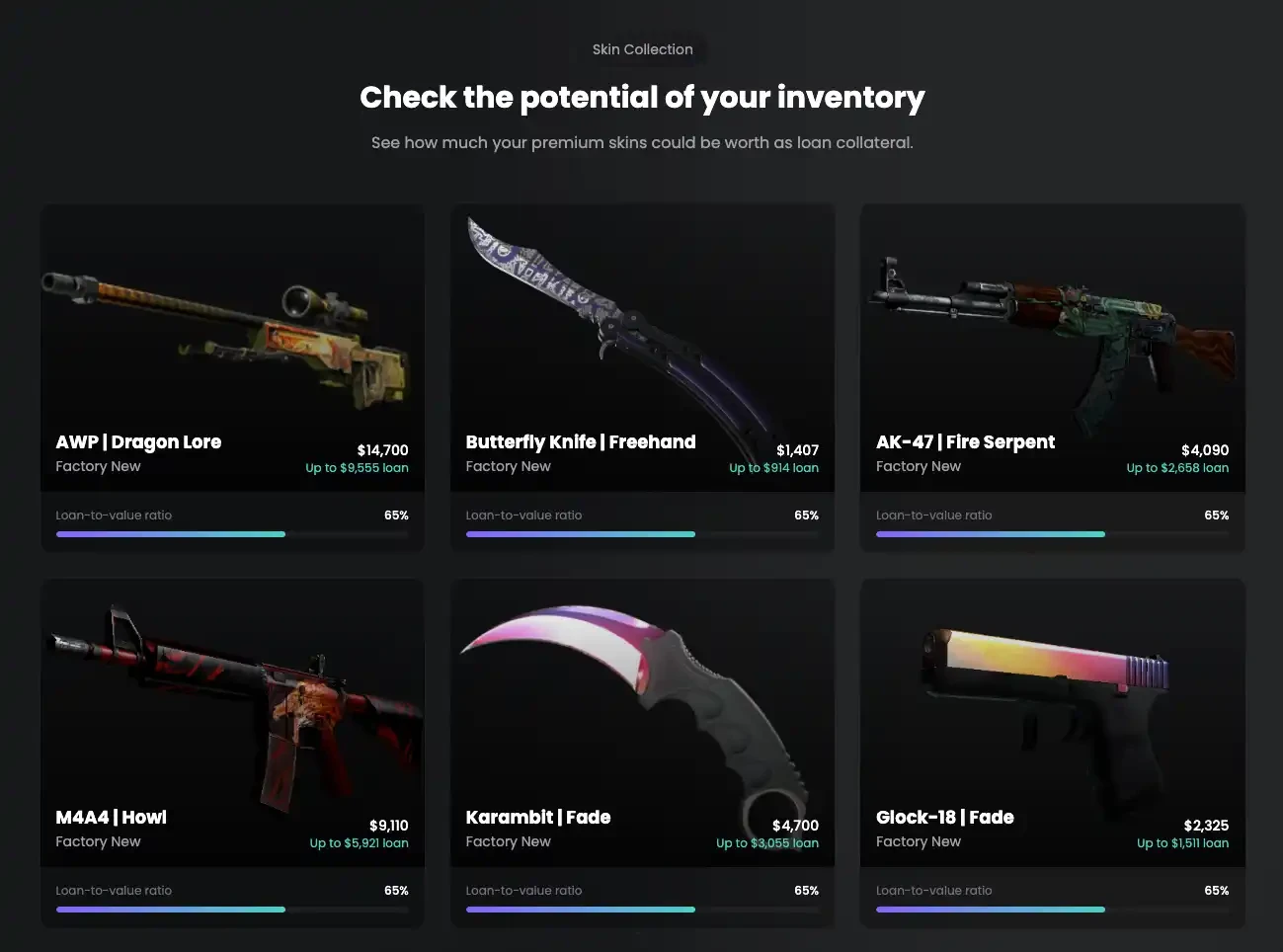 产品整体基础概念其实相当简单,团队认为 Counter Strike 2 的皮肤现在拥有近几十亿美元的庞大市场,但是却没有与之相匹配的流动性,而 CS 2 的皮肤与 DeFi 的产品在金融属性上来看有相当多的相似度,因此他们想做一个通过抵押借贷将游戏资产转化为金融工具的链上平台。
