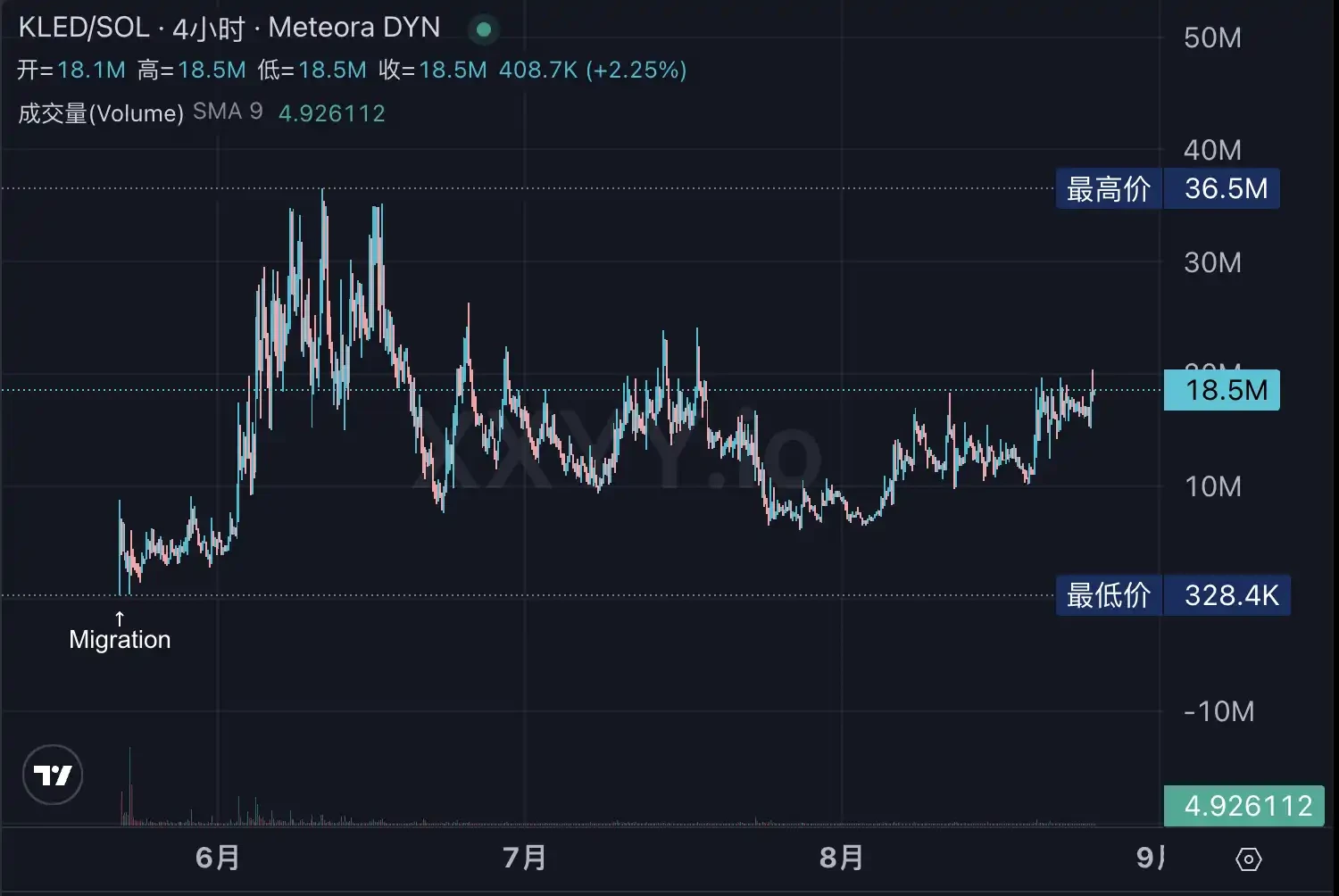 6 月 9 日,Kled V 2 宣布了下一阶段企业合约「Kled Pages」,并曝光与 YouTube、Twitch、Google Classroom 等平台的合作计划,同时还将与斯坦福大学、UC Berkeley 合办黑客松。这一系列进展为平台带来更多 B 2 B 收入预期并提升可扩展性,也点燃了社区的 FOMO 情绪推动 $KLED 价格创下新高市值一度达 3600 万美元,在热度褪去后在 1000 万美元市值上下浮动,现报价 1800 万美元。