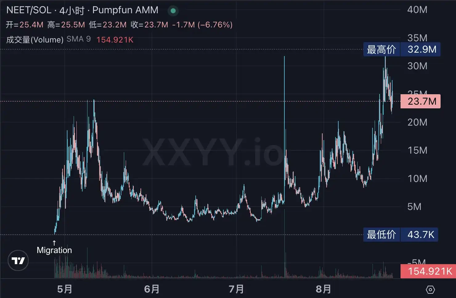 虽然在 Pumpfun 创始人 alon 首次买入 $neet 时,该代币瞬间在一分钟内爆拉近 4 倍,而后又很快跌破买入前的市值,但其价格走势始终保持稳固的走势。除了拥有许多喊单的「大哥」和深厚的社区文化以外,其推特的运营也相当不错。