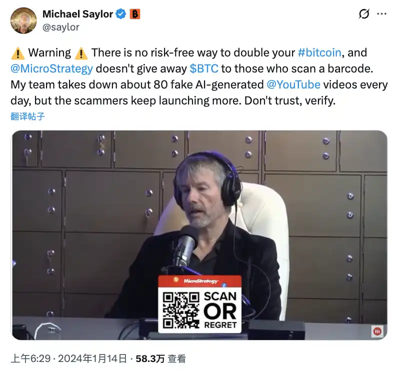 Saylor 面临的独特威胁还包括数字层面的攻击。2024 年 1 月,他的安保团队每天要删除约 80 个利用 AI 生成的深度伪造视频,这些视频冒充 Saylor 推广比特币骗局,诱导用户扫描二维码参与虚假的「比特币翻倍」活动。Saylor 本人在社交平台上警告称:「没有所谓无风险的比特币翻倍方法... 我的团队每天大约要删除 80 个伪造的 AI 生成 YouTube 视频... 不要相信,要验证。」