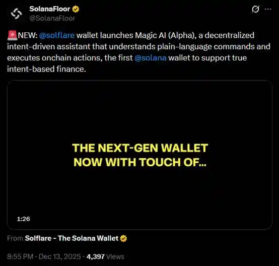 Solflare 推出 Magic AI,这是一个去中心化、意图驱动的助手,它能理解纯语言命令并执行链上操作。你只需用口语描述需求,比如「当 SOL 美元跌破 150 美元时,将我所有的 USDC 美元换成 SOL 美元。」Magic AI 会将其转化为精确、安全的链上操作。