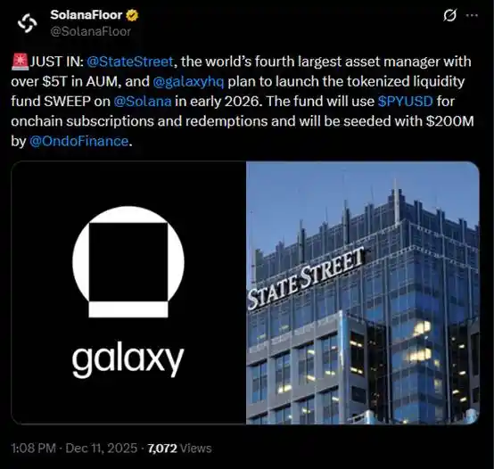 资管规模超过 5 万亿美元的全球第四大资产管理公司 State Street 计划在 2026 年初与 Galaxy Digital 共同在 Solana 上推出代币化流动性基金 SWEEP。该基金将使用 $PYUSD 在链上进行认购和赎回,并将由 Ondo Finance 提供 2 亿美元的种子资金。