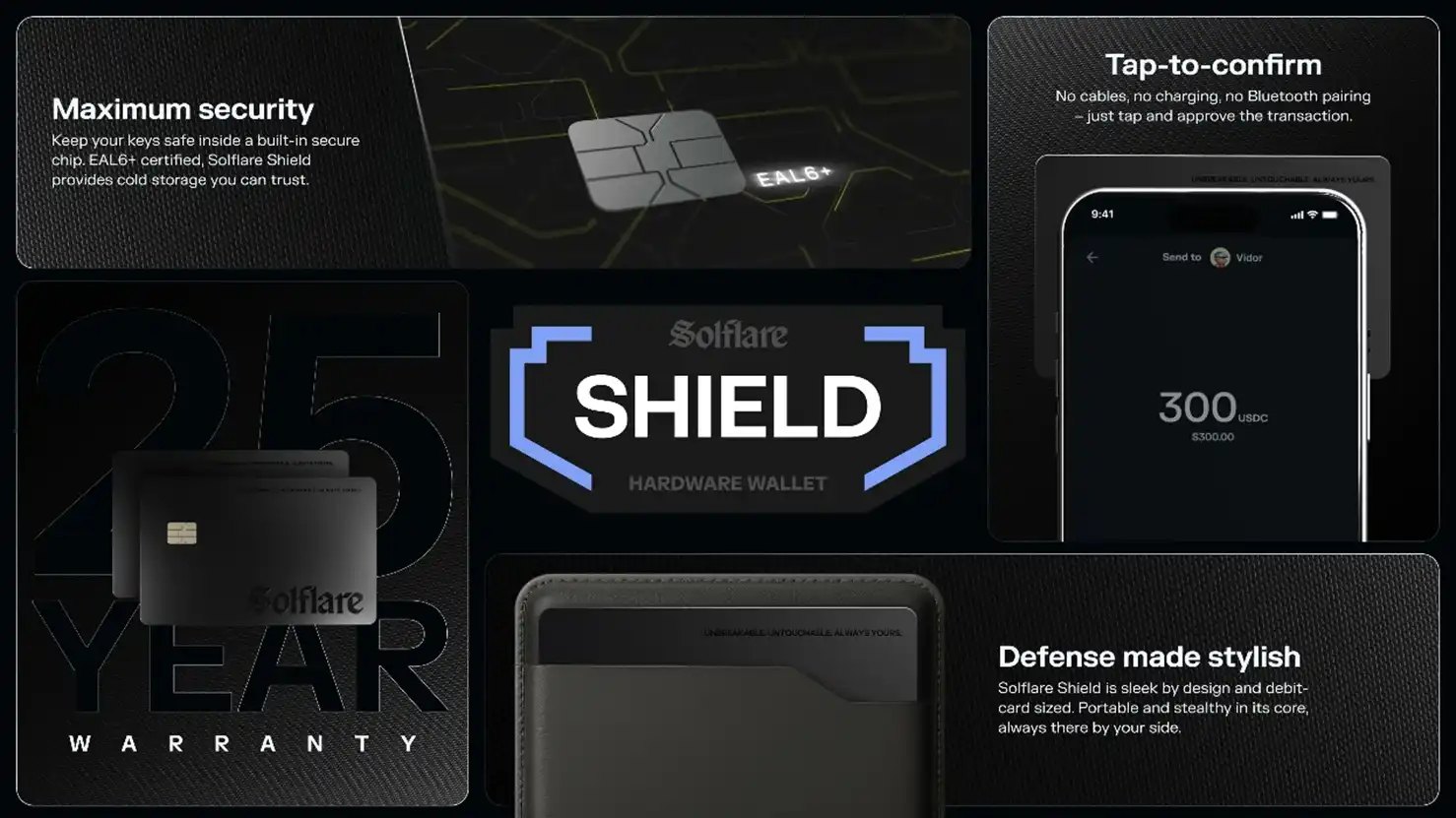 Solfare 宣布其新款钱包「Solflare Shield」开始发货,这是一款长得和银行卡一样的硬件钱包,通过 NFC 进行签名交易。