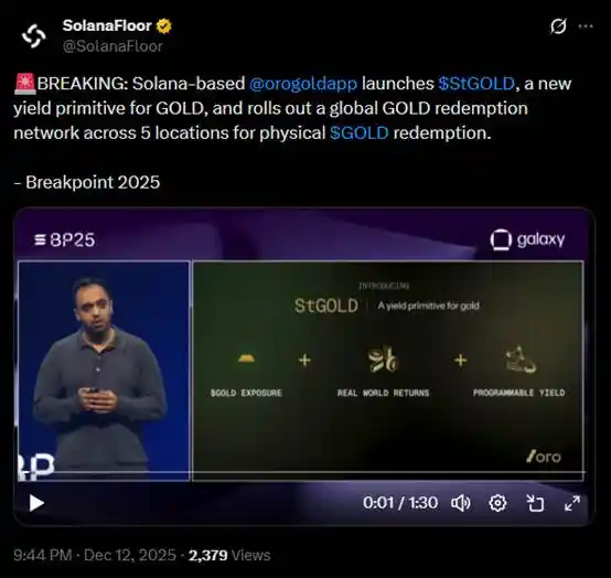Oro 是 Solana 上的数字黄金生息平台,他们宣布将推出 $StGOLD,一种全新的黄金生息代币。同时,他们将在全球 5 个地点部署可供用户兑换实体黄金的网点。