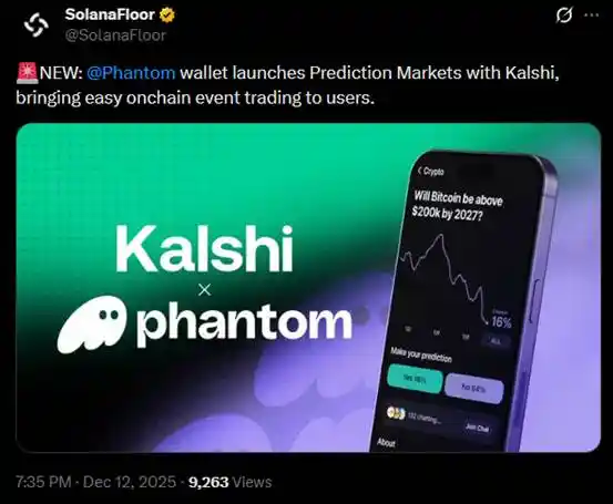Phantom 与 Kalshi 合作,将预测市场整合进了自家钱包中。Phantom 钱包用户将能够直接在钱包中使用任何 SOL 代币进行 Kalshi 上的交易。