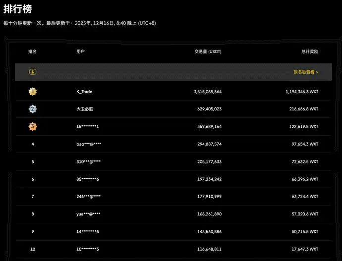 该活动自 11 月 26 日上线以来,吸引全球用户积极参与,交易热度持续攀升。据 WEEX 官网数据,截至 12 月 16 日 18:00 (UTC+8),「合约挖矿」排行榜前 100 的用户累计合约交易量达 91.72 亿美元,累计获得挖矿奖励 3,015,047.7 枚 WXT(数据持续更新中)。