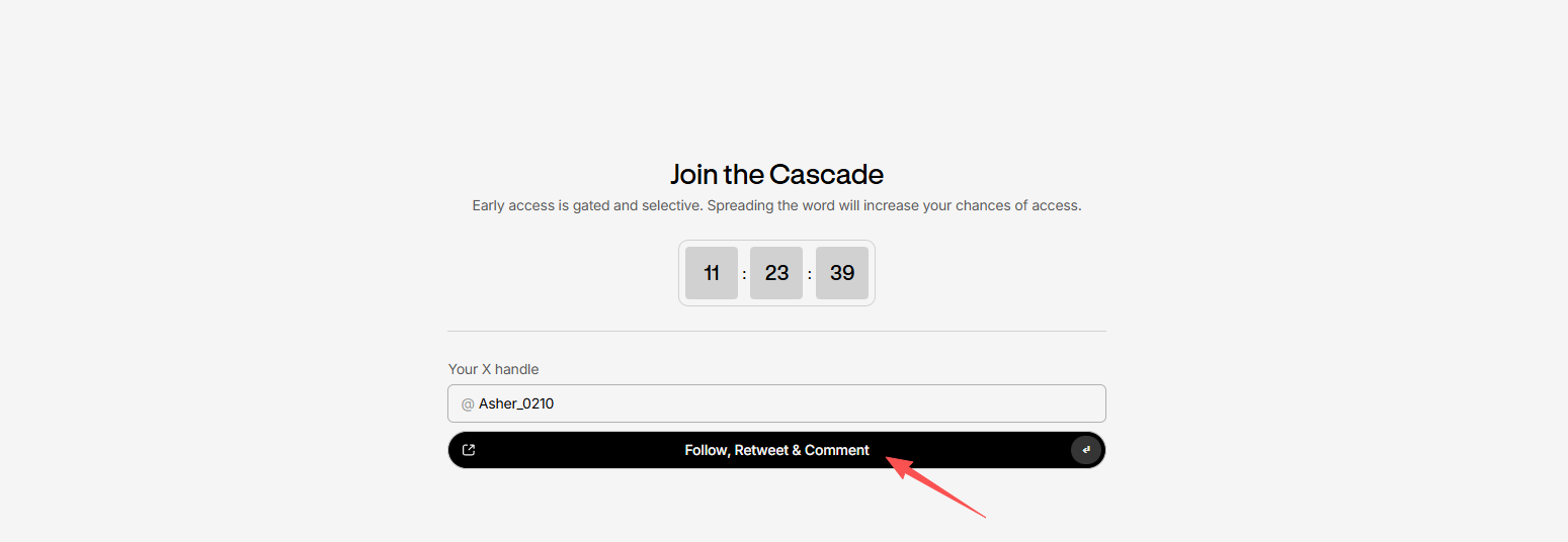 STEP 1. 进入官网(链接:https://cascade.xyz/join),填写个人 X 账号、谷歌邮箱完成早期访问申请(限时任务)。
