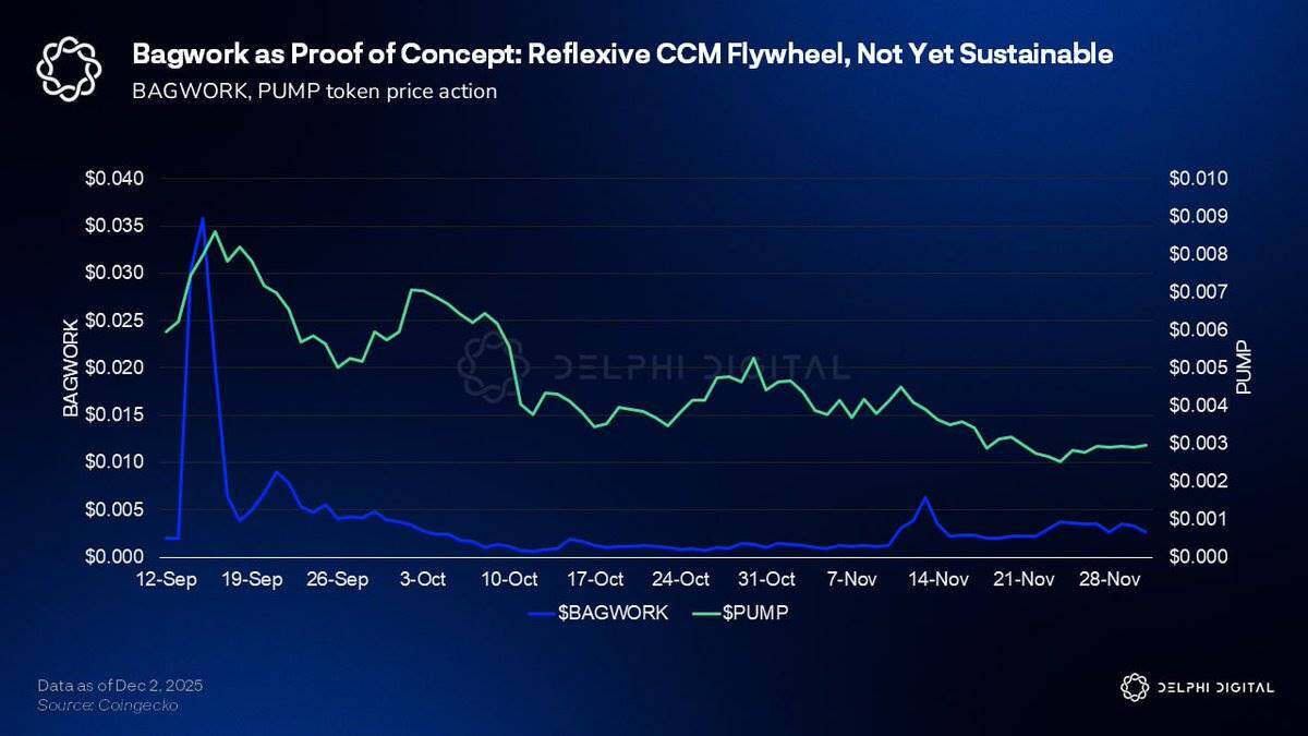 Pump 尚未成功吸引加密生态系统之外的核心创作者,而在 Pump 平台上兴起的 CCM 元宇宙(CCM meta)也只是昙花一现。最引人注目的时刻来自“Bagwork”活动,这一活动不仅展现了创作者驱动代币的潜力,也揭示了阻碍该模式发展的结构性问题。