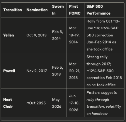 - 美联储主席鲍威尔的任期将于 2026 年 5 月结束,特朗普可能在 2025 年末宣布继任者;