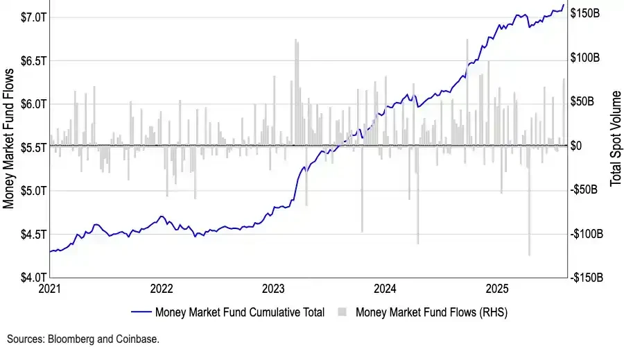 尽管许多人争论 9 月的降息是否会让加密市场短期见顶,但从资金流的角度看,这种担忧或许过度。美国货币市场基金规模已达创纪录的 7.2 万亿美元,大量资金被困在低风险工具中。历史上,货币市场基金的资金外流常常与风险资产的上涨形成正相关。随着降息落地,其收益吸引力将逐渐减弱,更多资金有望释放进入加密与其他高风险资产。可以说,这笔史无前例的现金储备,是这轮牛市最强大的潜在火药库。