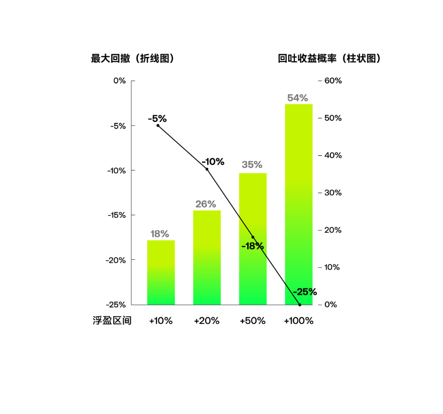 数据洞察:本次数据基于行为金融学论文,分析对比了不同浮盈区间下,未来 30 天的平均回撤幅度与收益回吐(超过 15%)概率的关系。当投资组合的浮动盈利超过 +50% 后,未来 30 天的最大回撤平均达到了 25%,而利润大幅回吐(超过 15%)的概率却急剧上升,达到 54%。行为金融学的经典论文也指出,个人交易者往往因为“贪婪”而过晚卖出,导致收益大幅缩水。