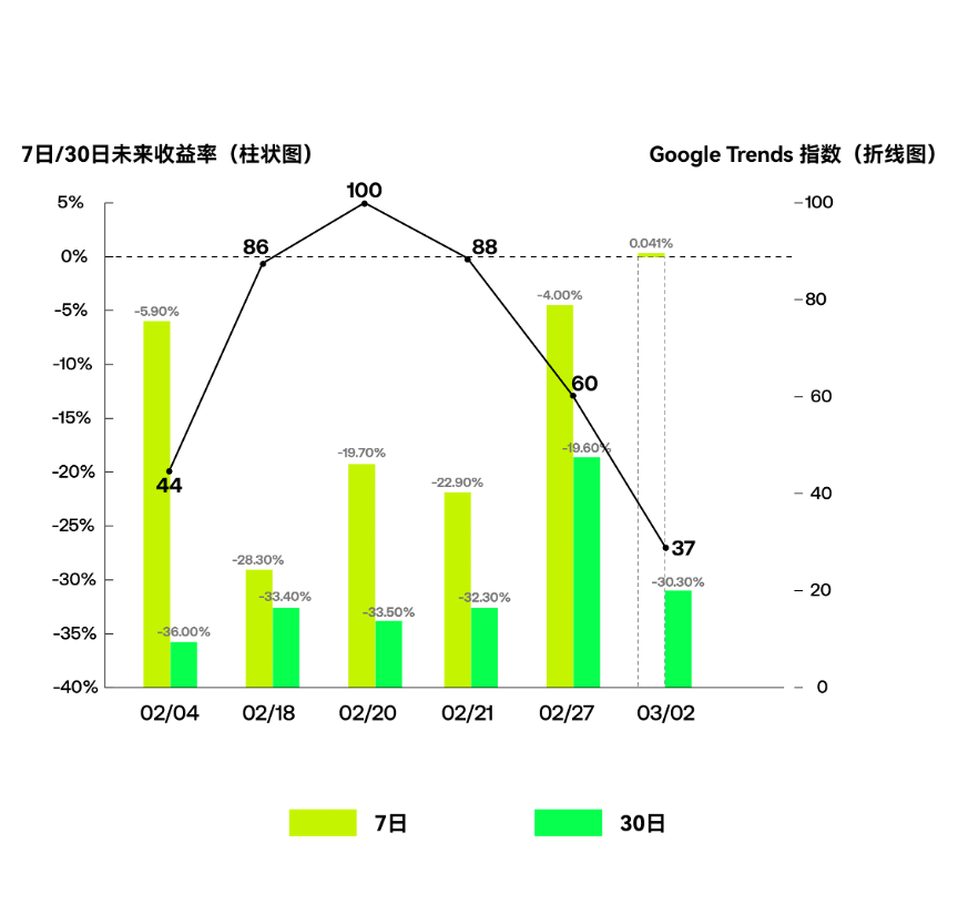 数据洞察:本次数据分析研究了加密货币(以 DOGE 和 TRUMP 代币为例)Google 搜索热度与投资者当日入场后的 7 天/30 天收益表现。复盘 DOGE 和 TRUMP 代币的过往数据,当其 Google Trends 热度达到 100 的峰值时,其后 7 天和 30 天的远期回报率,无一例外,均为显著的负数。公众情绪是资产价格的燃料,但当燃料燃烧到最旺盛的时刻,也意味着它即将耗尽。当所有潜在的买家都已入场,市场便失去了继续上涨的动力,只剩下获利盘的出逃和踩踏。