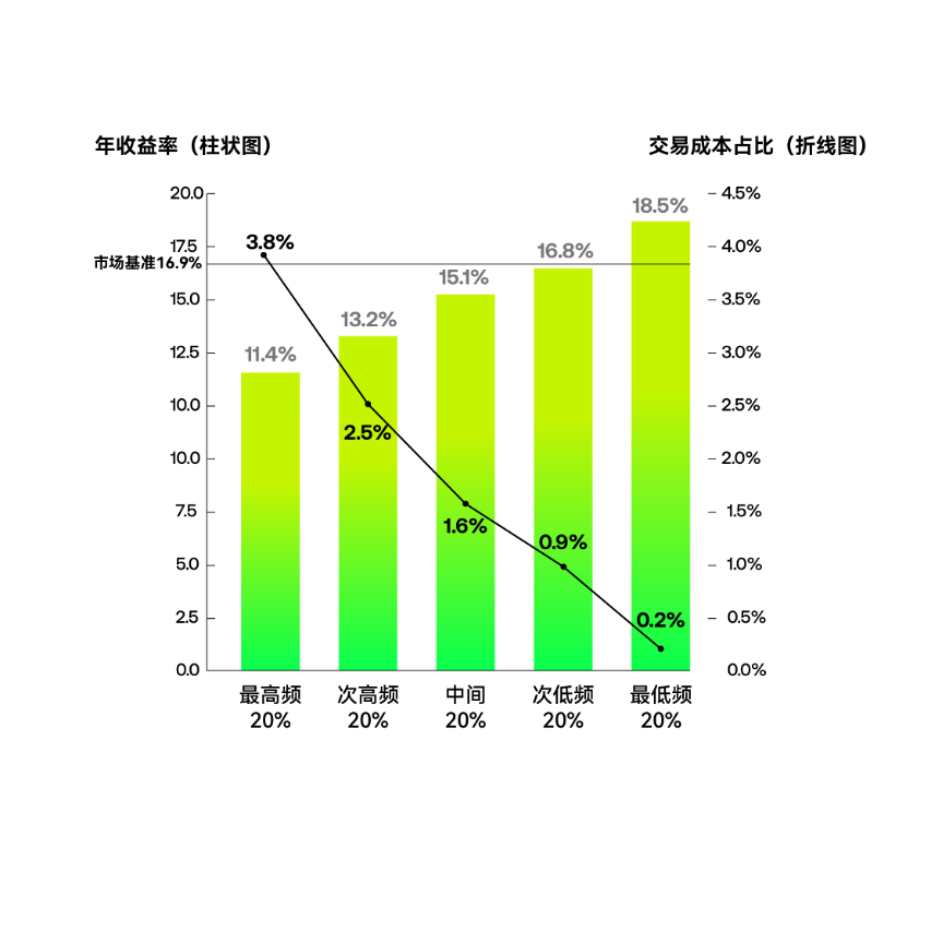 数据洞察:本次数据基于传统金融个人投资者交易频率研究,分析不同交易频率区间用户的收益表现与交易成本差异。交易频率最低的 20%用户组,其年化收益率高达 18.5%,不仅跑赢了其他所有组,甚至超越了 16.9% 的市场基准。相反,最高频的交易组,在付出了高达 3.8% 的交易成本后,最终收益率仅为 11.4%,远远跑输大盘。