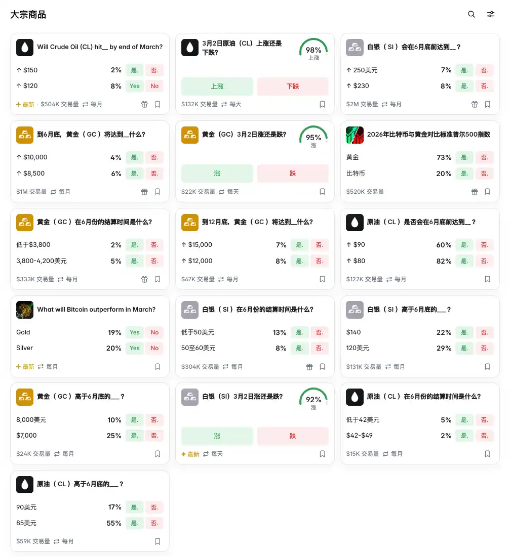 鸡蛋只是其中一个例子,Polymarket 上能交易的传统资产标的远比我们想象的更多:从原油 CL、黄金 GC、白银 SI 这些大宗商品,到各种外汇价格,再到住房数据,都能在 Polymarket 上找到盘口。