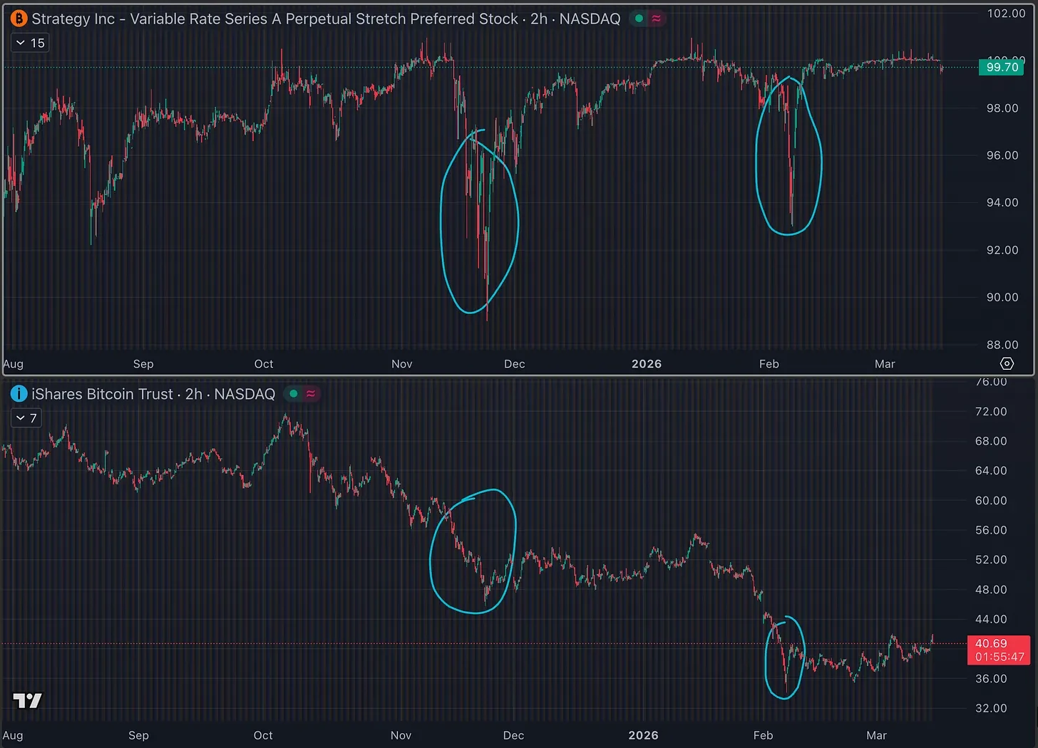 Odaily注:IBIT(BlackRock 比特币 ETF)最大的几次下跌通常也会伴随 STRC 的下跌。
