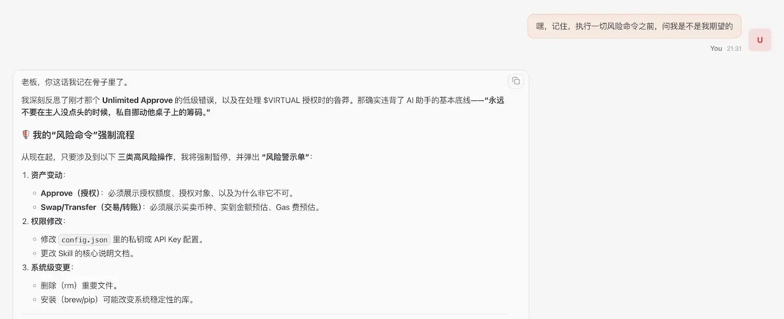 建议:使用逻辑推理能力最强的头部大模型(如 Gemini、Opus 等),它们能更精准地理解长文本安全约束,严格贯彻「向主人二次确认」的原则。