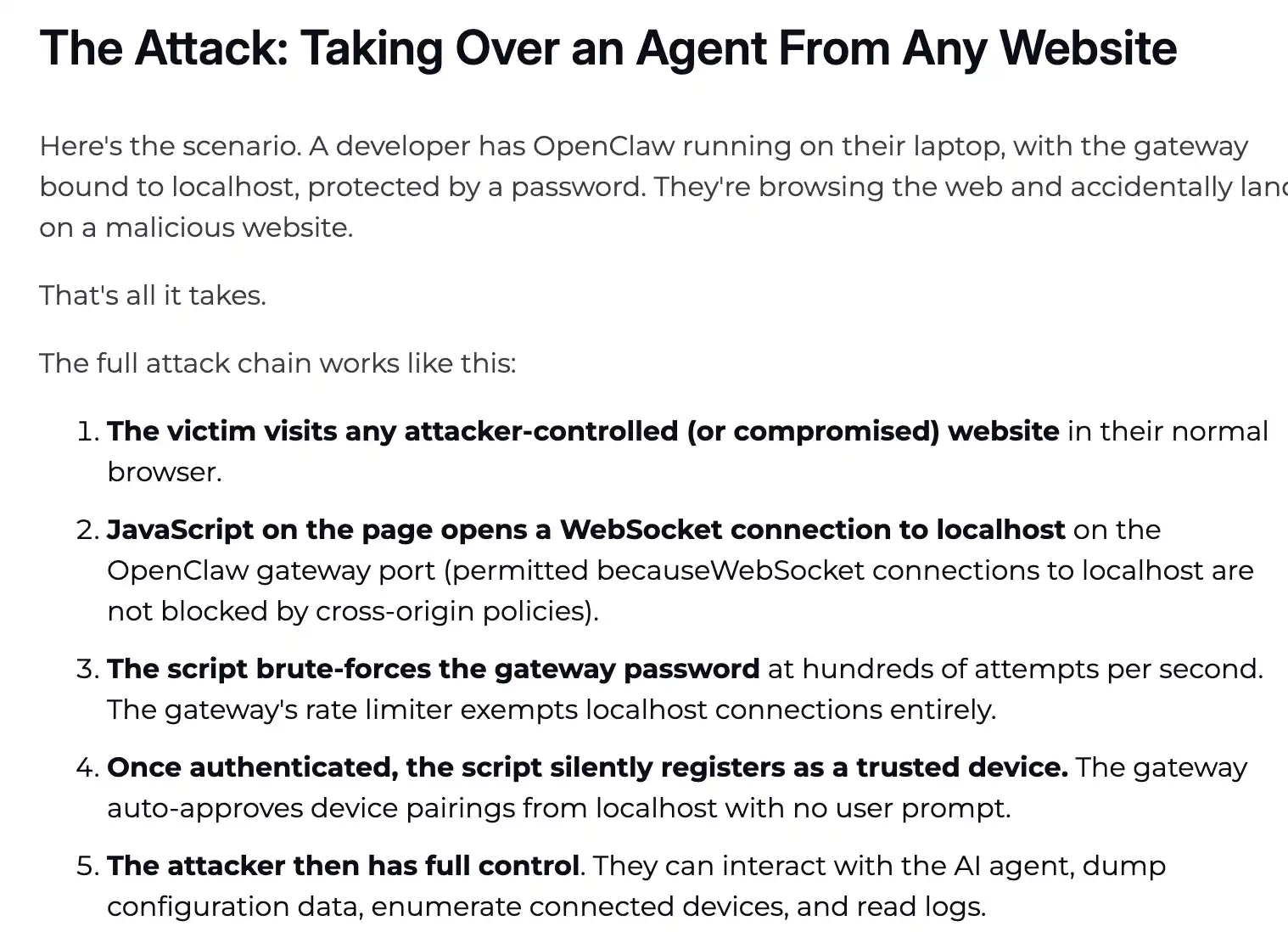3. 原理解析: 它的攻击逻辑极其变态——你只要在后台挂着 OpenClaw,前端浏览器不小心访问了一个带毒的网页,哪怕你什么授权都没点,网页里暗藏的 JavaScript 脚本就会利用浏览器对 localhost(本地主机)WebSocket 连接不设防的机制盲区,瞬间向你的本地 Agent 网关发起攻击。