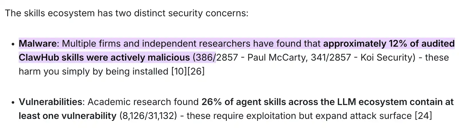 1. 真实案例: 根据 Paul McCarty 和 Koi Security 等多家安全机构与独立研究员的最新联合审计报告,ClawHub 市场上高达 12% 的审计技能包(抽样 2857 个中发现了近 400 个毒包)是纯粹的活跃恶意软件。