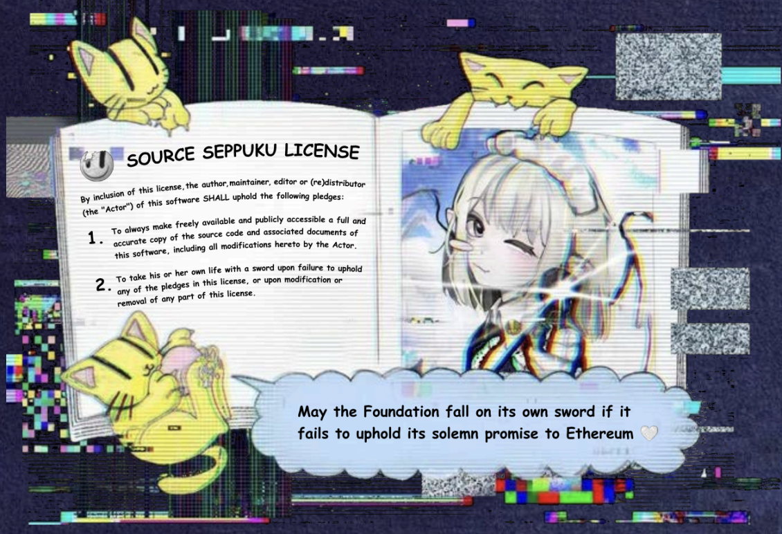 EF 还创作了一张「SOURCE SEPPUKU LICENSE(源码切腹许可证)」梗图,上面写着:「若基金会未能信守对以太坊的庄严承诺,就让它自食其果、自我了断」。