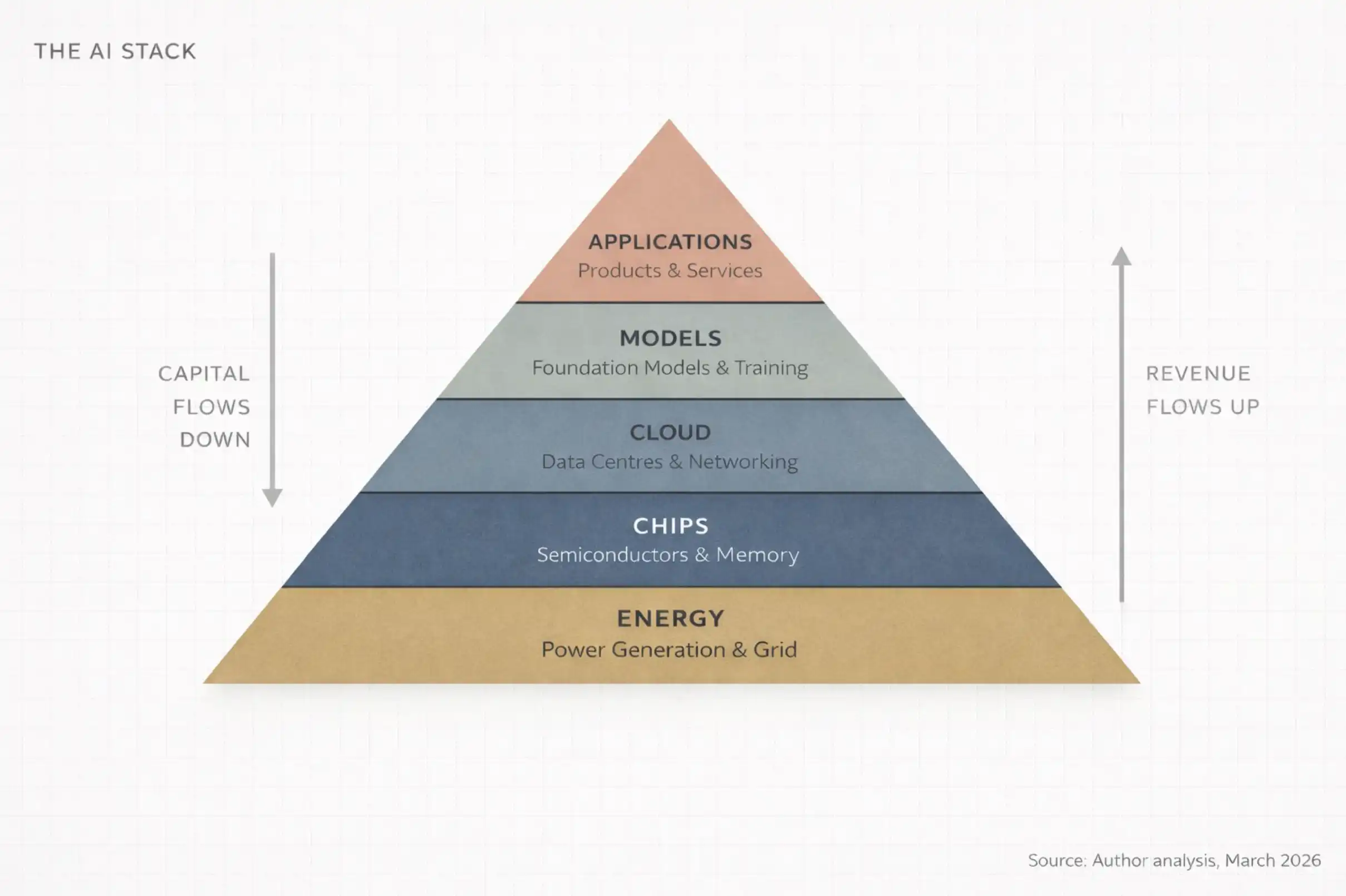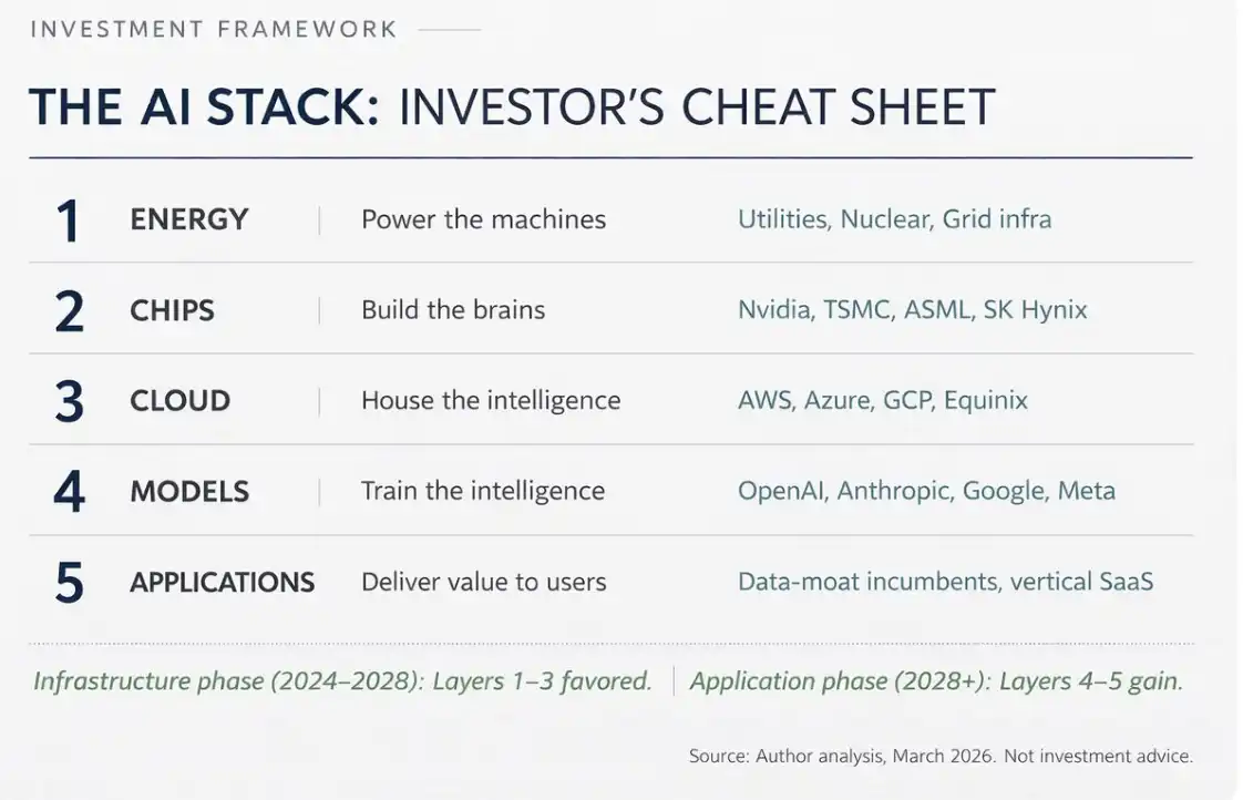 我想带你完整走一遍 AI 的价值链:从给数据中心供电的电力开始,一直到你手机里的应用。