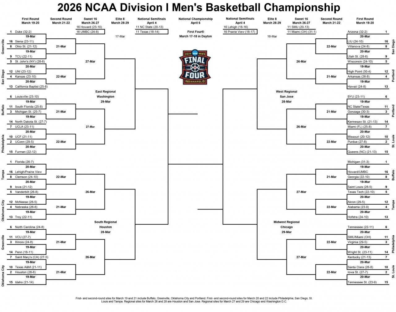 根据昨日抽签确认的赛程表,2026 年“疯狂三月”将于北京时间 3 月 18 日(明日)正式开打。68 只通过数月的常规赛事厮杀而拿到“疯狂三月”参赛资格的大学球队将就此展开冠军争逐,首先进行的将是首轮附加赛(First Four),8 只附加赛球队将会直接淘汰 4 只,剩下的 64 只球队将通过五轮的单场胜负淘汰赛(64 强 → 32 强 → 甜蜜 16 强 → 精英 8 强 → 最终 4 强 → 总决赛 → 全国总冠军)决出最终的胜者。