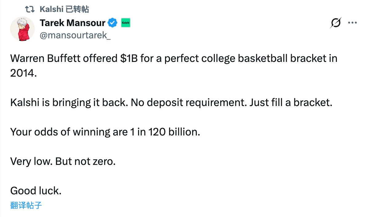 3 月 17 日凌晨,预测市场 Kalshi 于 X 发文宣布,将效仿股神巴菲特,为即将开打的 NCAA “疯狂三月”赛事推出“完美预测挑战赛”(Perfect Bracket Challenge)—— 完美预测所有对阵结果的用户将可拿走 10 亿美元的超级大奖。