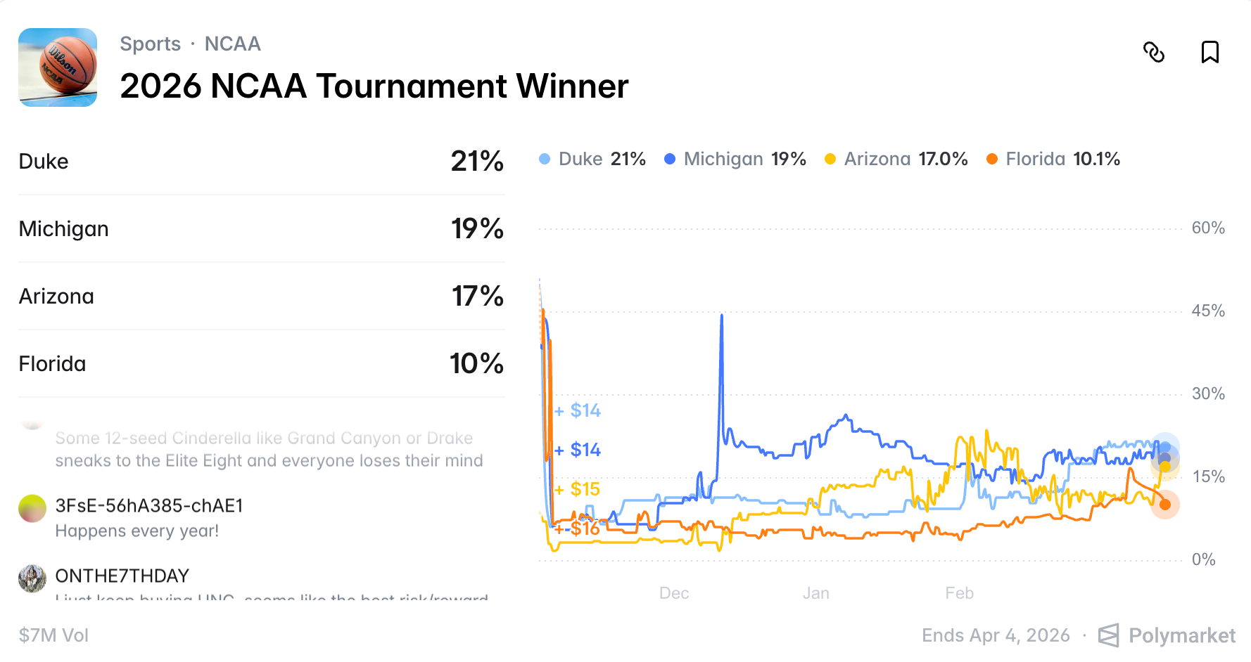 Polymarket 实时概率显示,目前“疯狂三月”冠军赔率排名前四的大学分别为四大赛区的一号种子:
