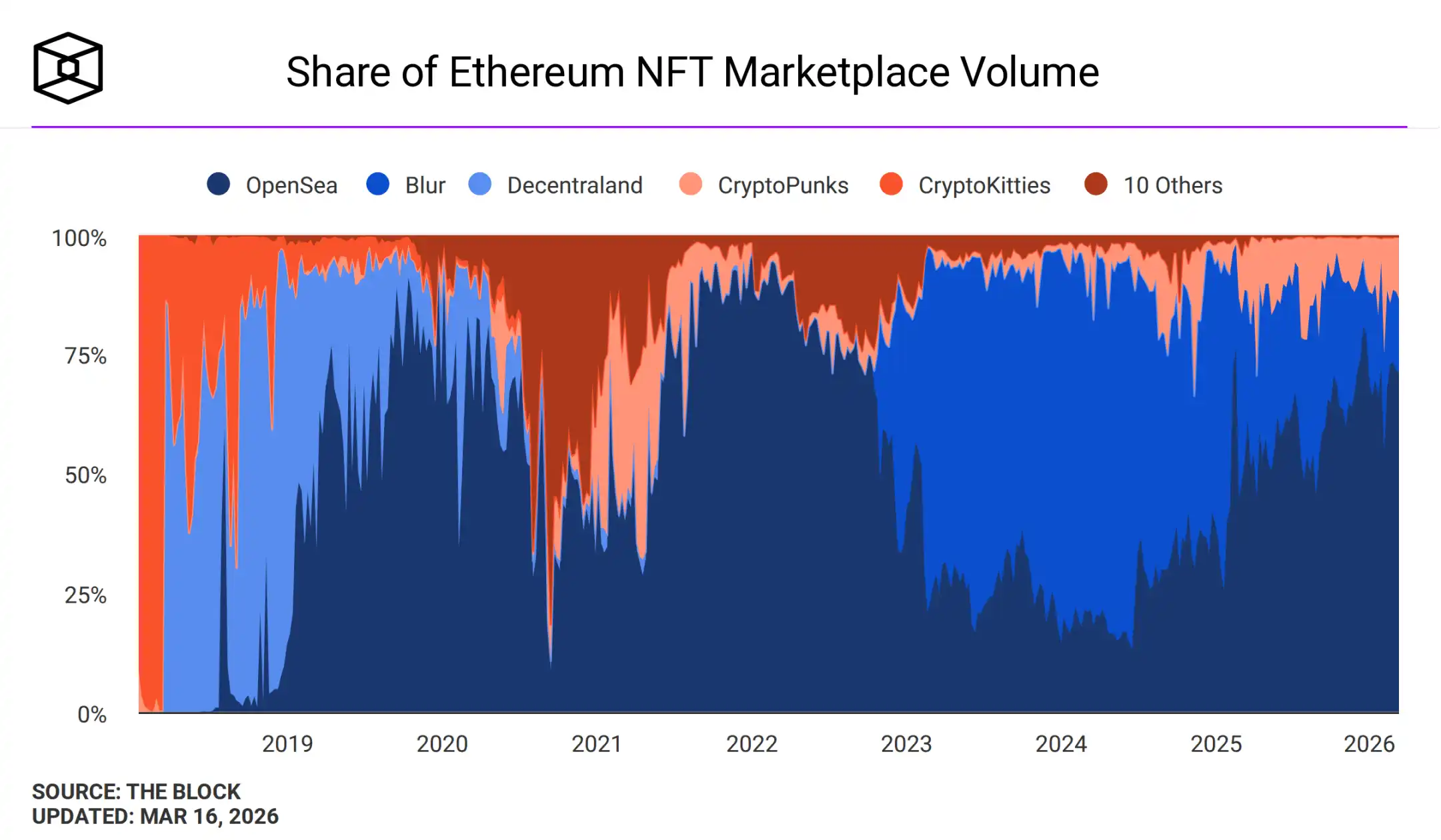 OpenSea 在这一背景下的市占率反而上升,但支撑数字的已不是 NFT。根据 The Block 数据显示,OpenSea 当前以太坊 NFT 交易市占率约 71%,SEA 代币宣布后,市占率一路攀升,但 2025 年 10 月 26 亿美元的月交易量中,超过 90% 来自代币交易,NFT 本身的交易量依然疲软。