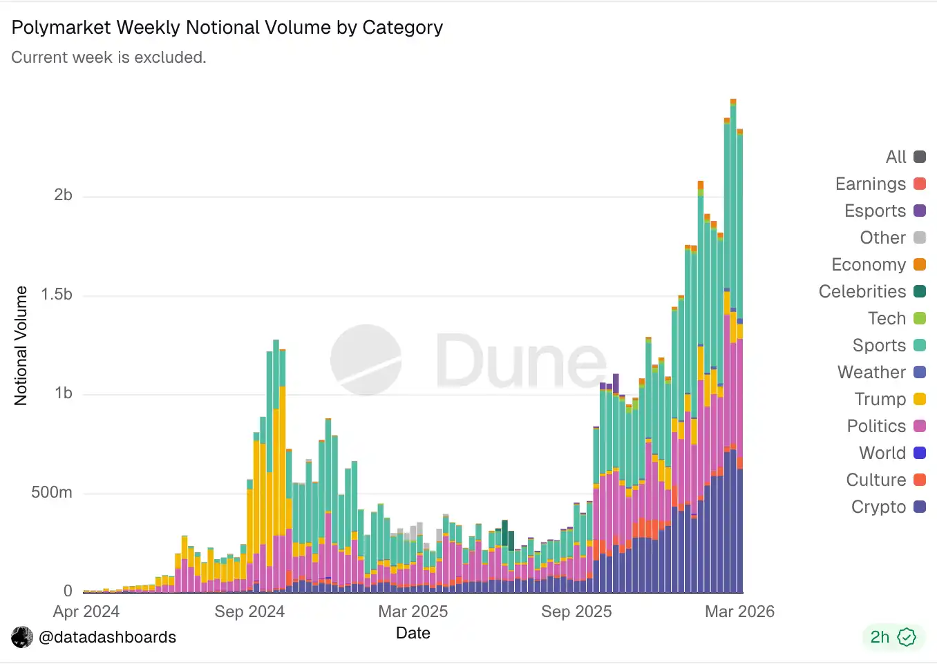 收费市场范围方面,Polymarket 已于 3 月 6 日将手续费机制扩展至所有加密货币相关市场外,此外更早之前还已在 NCAA、意甲等体育市场试行手续费征收,但前者(加密货币相关市场)目前仍是手续费收入的主要来源。
