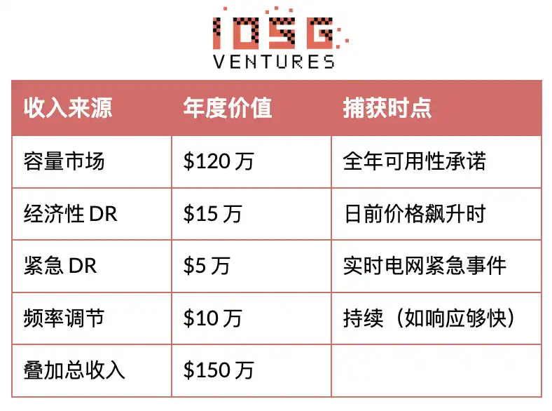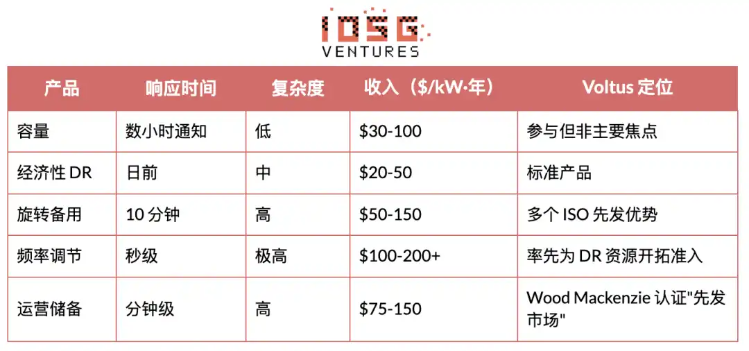 3. 辅助服务($/MW + $/MWh):频率调节、旋转备用等。价值更高但要求更快响应(秒至分钟级)。Voltus 率先开拓了这些更高利润率产品的准入。