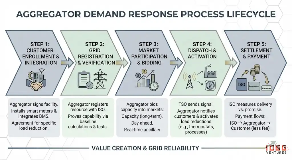 聚合商将这 2 MW(连同数千个其他站点)作为「需求响应资源」注册至 ISO。聚合商必须证明该资源确实能够交付,包括基线计算、计量协议,有时还需要测试调度。