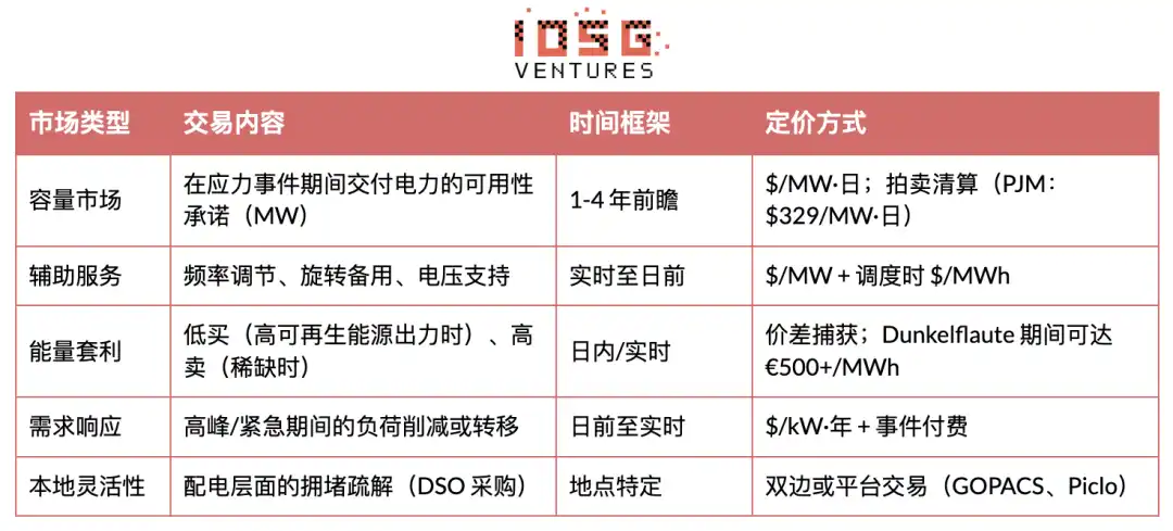 单位 $/kW 更高(容量市场的 2-3 倍);竞争者更少(复杂性构成壁垒);需要精密软件(Voltus 的优势所在);但要求更快响应的资产。