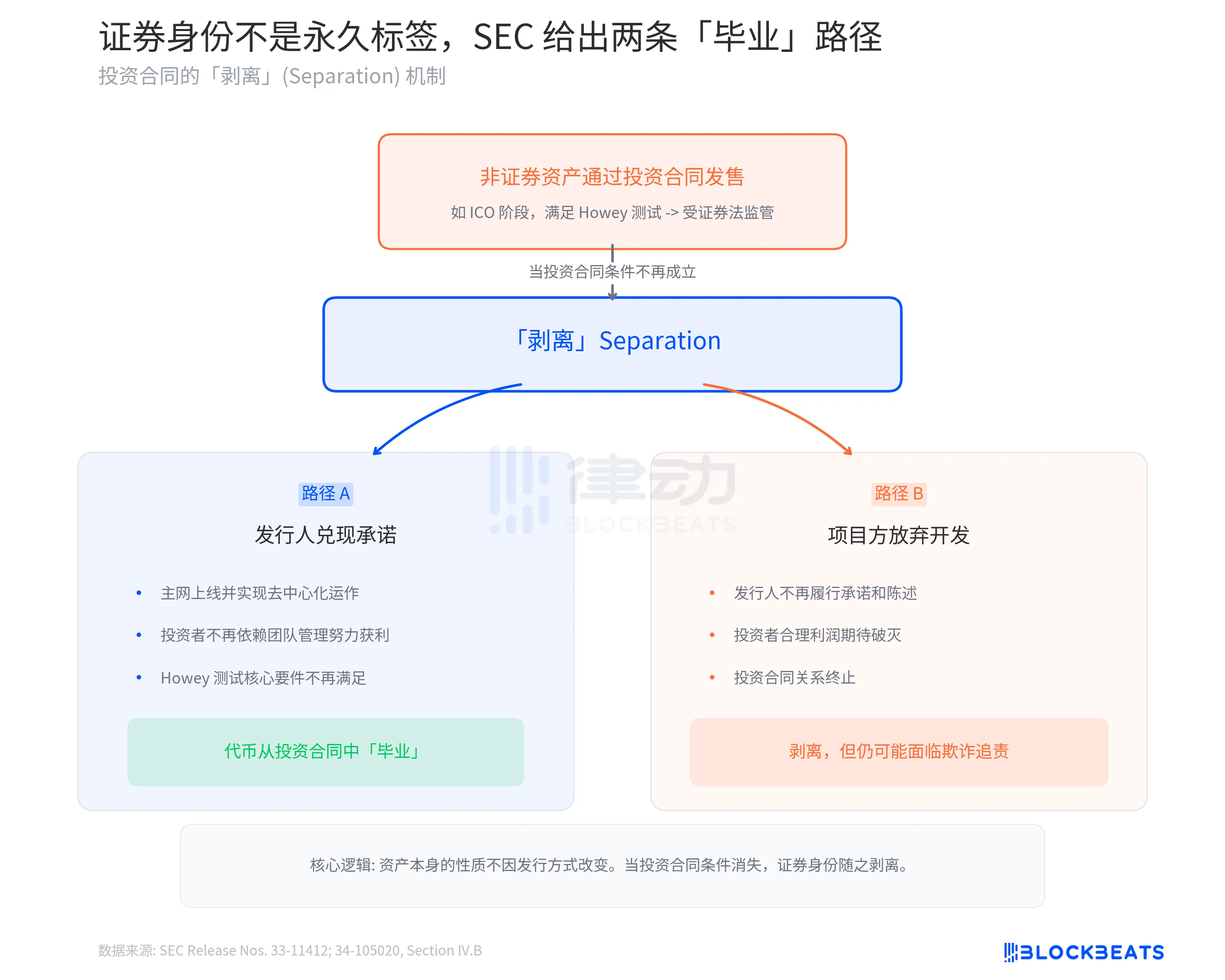 这份文件中最值得细读的部分,可能是 SEC 对「剥离」(Separation)机制的阐述。文件明确规定,一个本身不是证券的加密资产,可以因为发行方式(如通过投资合同发售)而被纳入证券监管。但当投资合同的条件不再成立时,这个资产可以与证券身份「剥离」。