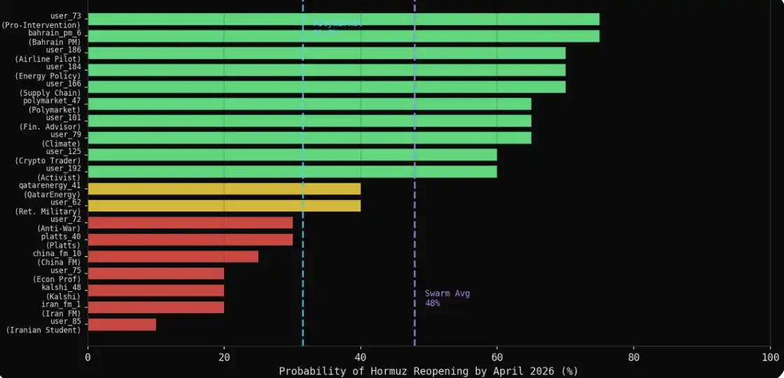 那些自然表达中的悲观者,反而是最好的预测者。在模拟中给出 ≤30% 概率的 7 个代理(伊朗外长、中国外长、Kalshi、Platts、一位经济学教授、一名伊朗学生、一位反战活动人士),平均值为 22%,与 Polymarket 的结果相差不到 10 个百分点。专业知识 + 自然表达 = 最接近市场。
