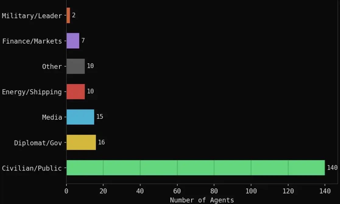 我最初从知识图谱中生成了 43 个核心代理。之后,系统还能把这些核心角色扩展到你想要的总数量。我最后把总代理数设成了 200,并额外加入了更多样化的平民角色,例如加密交易员、航空公司飞行员、教授、学生、社会活动人士等。