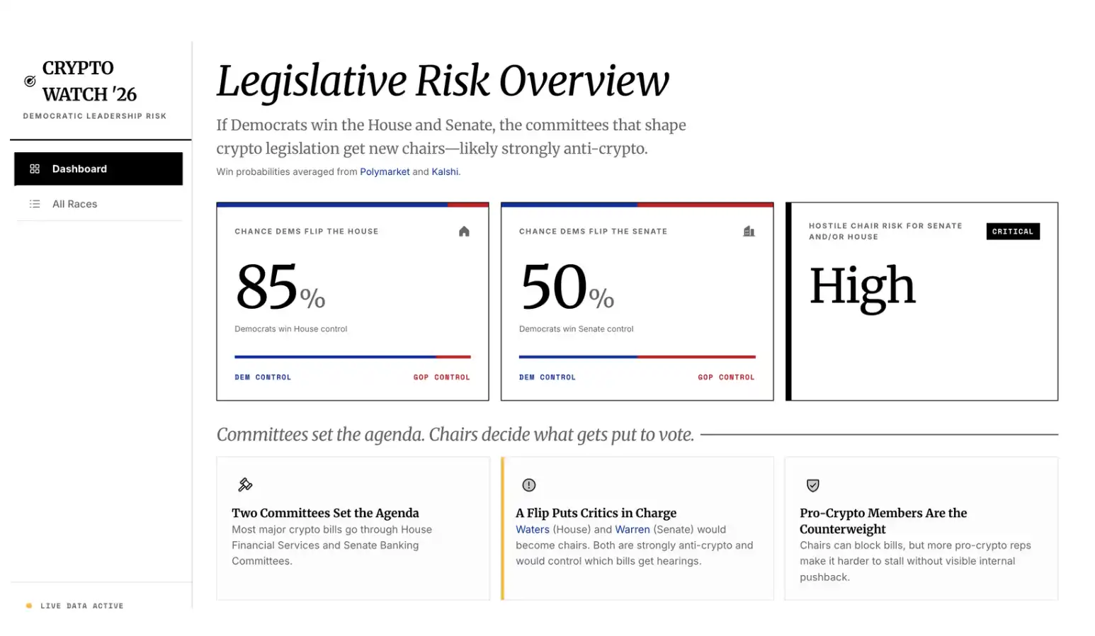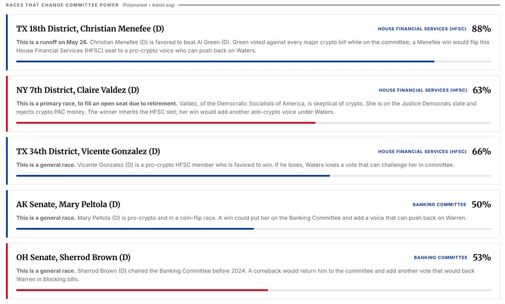因此,真正会影响加密政策走向的,其实是少数几个关键选区的竞选结果——这些选举将直接改变委员会的成员构成,从而决定法案是否有机会被讨论,而不仅仅是被投票。