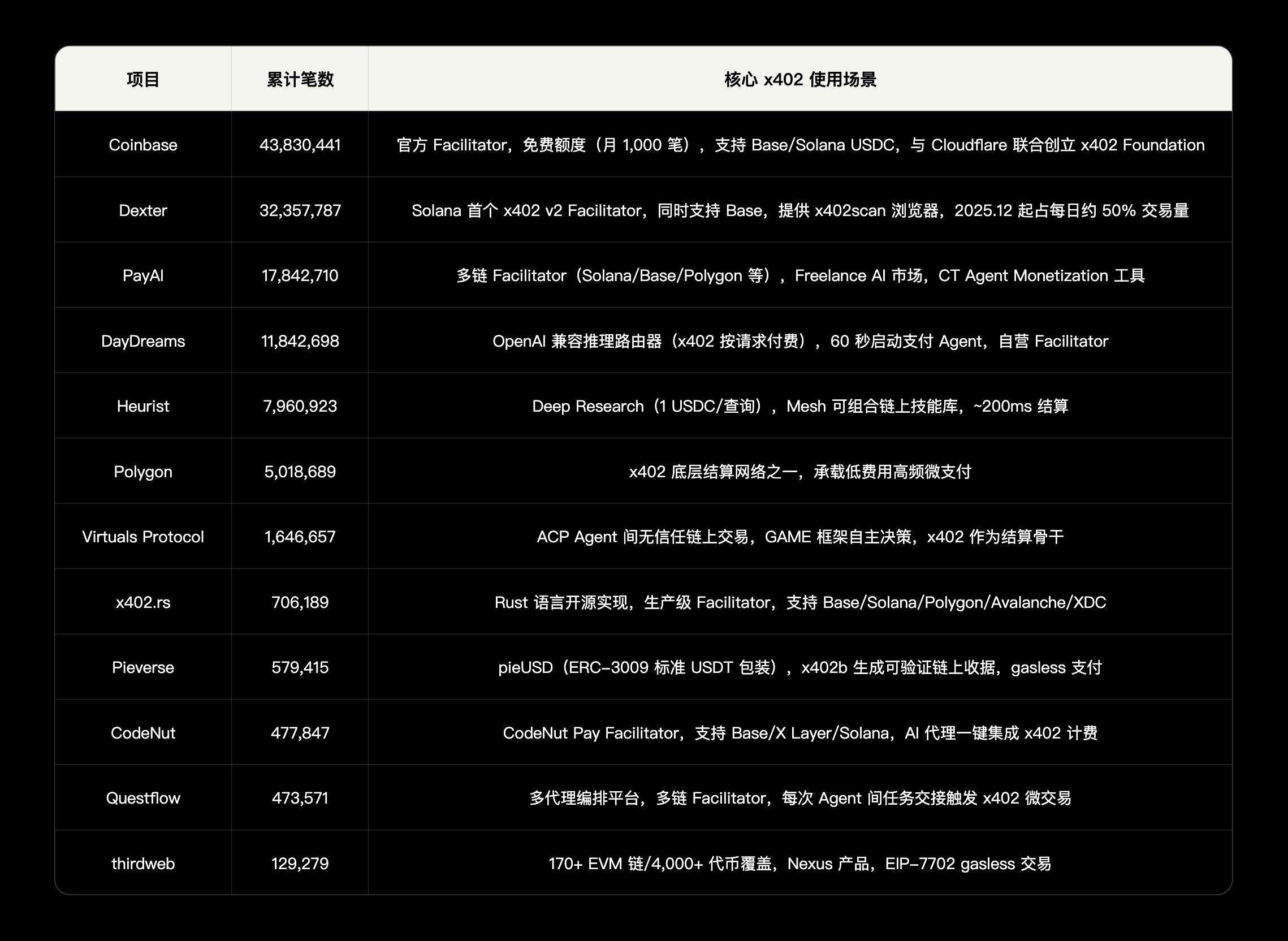 V2 标准化了网络和资产的识别方式,创建了一个可跨链和传统支付轨道运行的统一支付格式 X402。Base、Solana、其他 L2 以及 ACH、SEPA、银行卡网络全部纳入同一个支付模型。这是最关键的升级——x402 从“加密支付协议”变成了打通 Crypto 和传统金融的中性支付层。