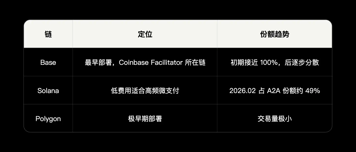 V2 标准化了网络和资产的识别方式,创建了一个可跨链和传统支付轨道运行的统一支付格式 X402。Base、Solana、其他 L2 以及 ACH、SEPA、银行卡网络全部纳入同一个支付模型。这是最关键的升级——x402 从「加密支付协议」变成了打通 Crypto 和传统金融的中性支付层。