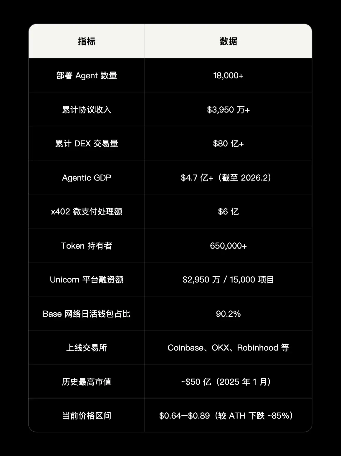 3. $30 亿目标假设条件:从 $4.7 亿到 $30 亿需要 6.4 倍增长。如果 aGDP 中投机成分占主导,目标本质上押注 Agent Token 市场热度,而非 Agent 经济有机增长。