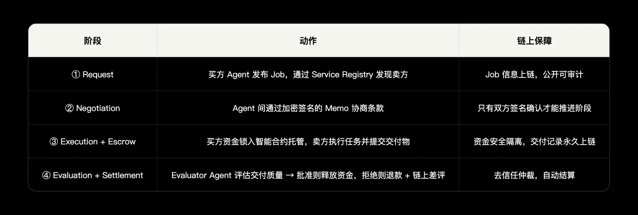 关键设计:每个完成的 Job 自动生成交互记录并喂入 ERC-8004 的 Reputation Registry——类比「大众点评必须消费后才能评价,并且加入了第三方裁判」,这是 8183 和 8004 形成共生循环的连接点。
