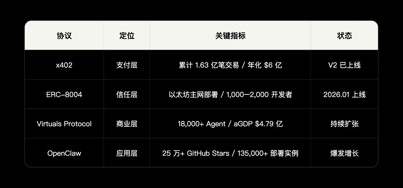 x402(支付层)由 Coinbase 与 Cloudflare 联合推出,将稳定币微支付嵌入 HTTP 协议层。截至 2025 年底已处理超过 1 亿笔交易,年化支付量达 6 亿美元。